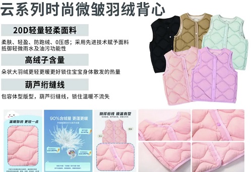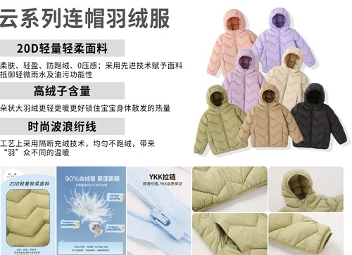 对羽绒服垂直领域非常专业,从羽绒.面料到设计都有非常成熟的思考和生产能力。主打系列 女装,亲子装 羽绒产品的开发和生产,不过度的突出单独设计点,把精力分给每一个版以呈现混然天成的美感的比例与配色搭配碰撞风格为日常的穿着搭配提供更多的可能性。
