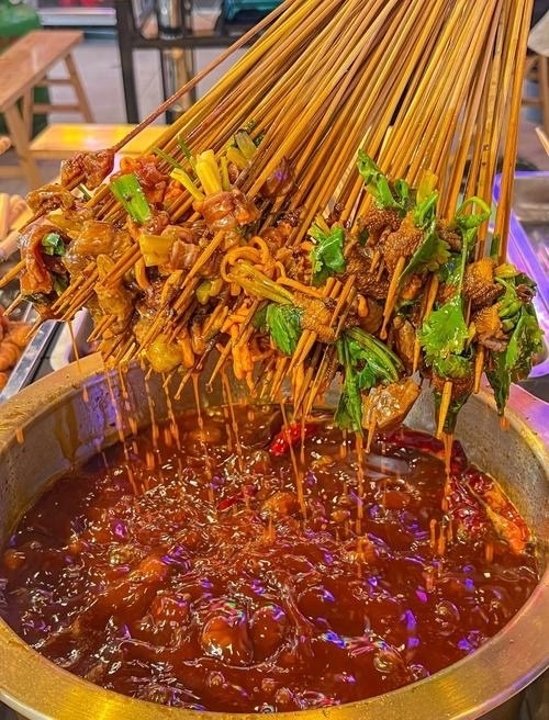 串串香:将各种食材串在竹签上,放入滚烫的锅中煮熟,再蘸上特制的调料,既方便又美味