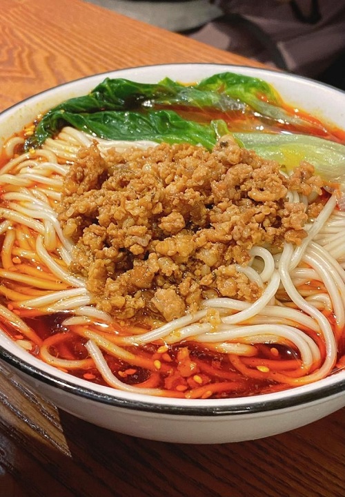担担面:细薄的面条配上特制的肉酱、葱花、辣椒油等调料,咸香微辣,香气扑鼻,面条爽滑劲道