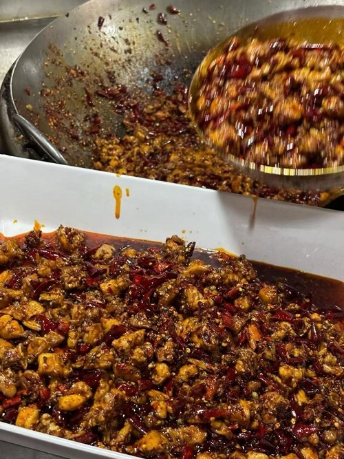 手撕烤兔:兔肉烤制后撕成肉丝,和花生、芝麻、辣椒拌在一起,肉质紧实,入口油润。