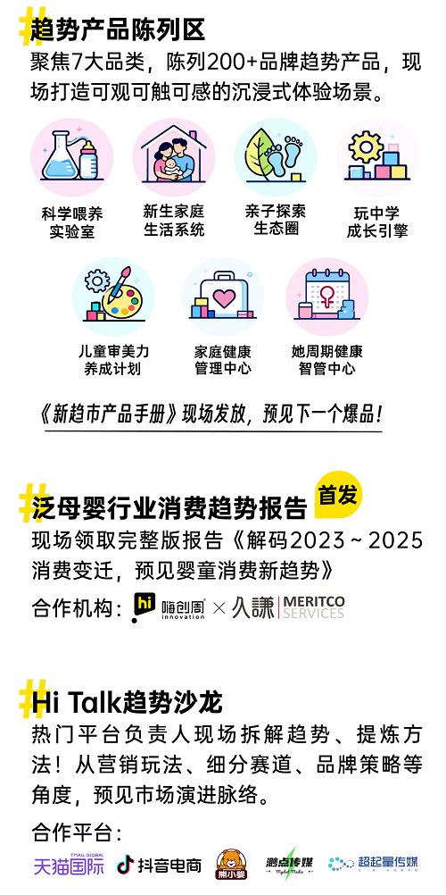 本届展会规模再度升级,集结25,000多位新渠道、大买家与1,000多个泛母婴全品类趋势品牌,现场呈现超100场创新活动,聚焦Hi Baby宝贝优品、Hi Family亲子生活、Hi Lady女性及全家健康、Hi Pet人宠共生四大趋势,持续拓宽泛母婴生态边界。